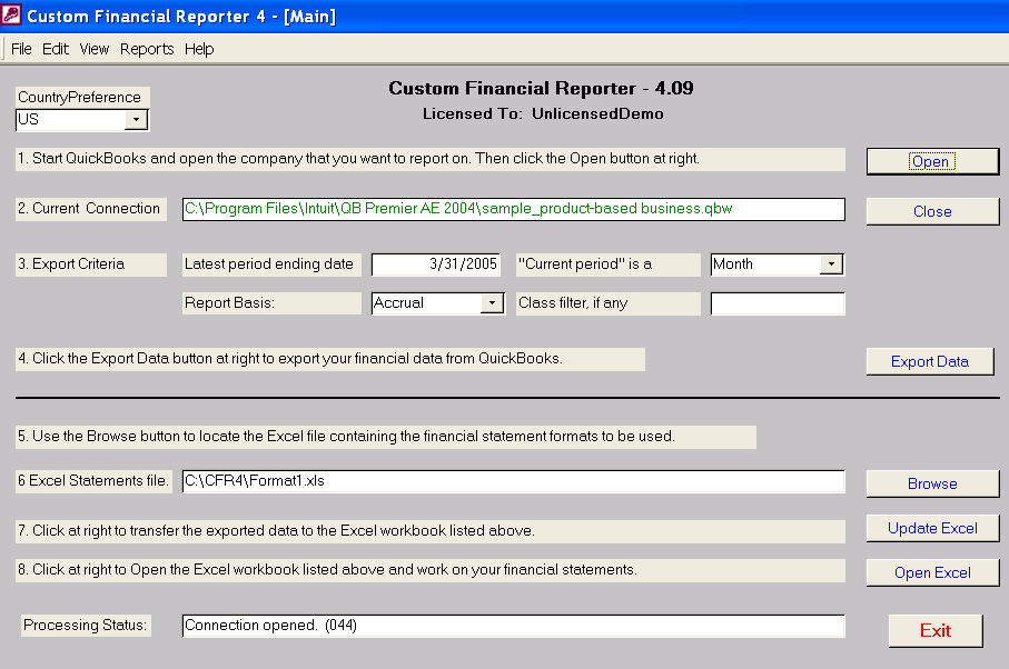 2. Trial Balance sheet in Excel. This sheet contains data exported from QuickBooks and user provided "Row Names" that link the trial balance to user defined financial statement format sheets.